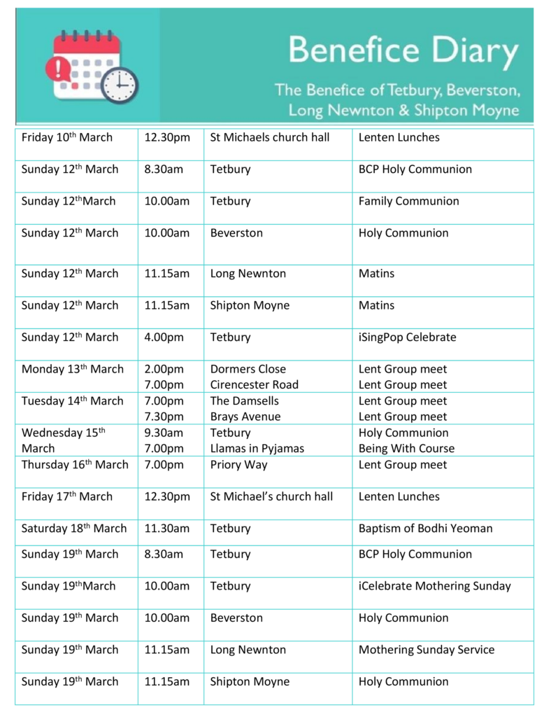 Services in our churches week beginning 12th March Sunday 12th March St Marys’ Tetbury 8.30am: BCP Holy Communion St Marys’ Tetbury 10.00am: Family Communion Worship is led by Revd Pauline…