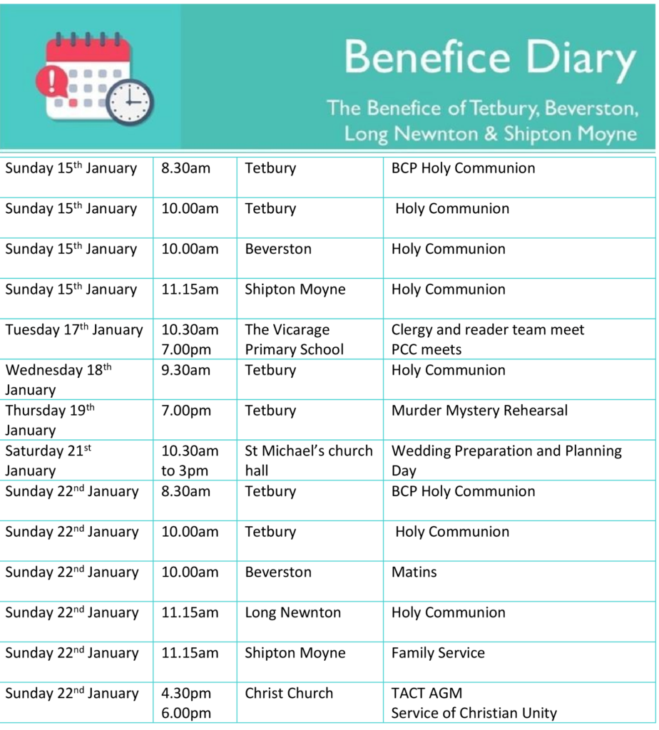 Services in our churches week beginning 15th January 2023 Sunday 15th January St Mary’ Tetbury: 8.30am: BCP Holy Communion St Marys’ Tetbury: 10.00am Family Communion St Mary’s Beverston 10.00am: Holy…