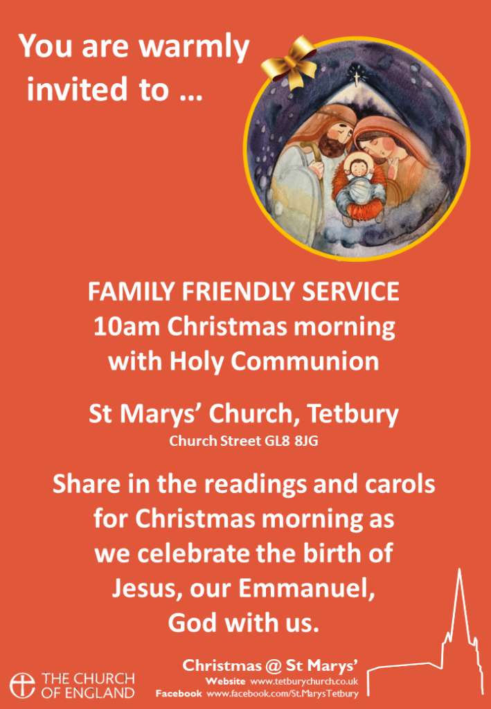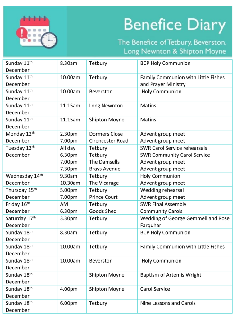 Services in our churches week starting Sunday 11th December 2022 St Mary’ Tetbury 8.30am: BCP Holy Communion St Mary’ Tetbury 10.00am: Family Communion with Little Fishes and Prayer Ministry St…