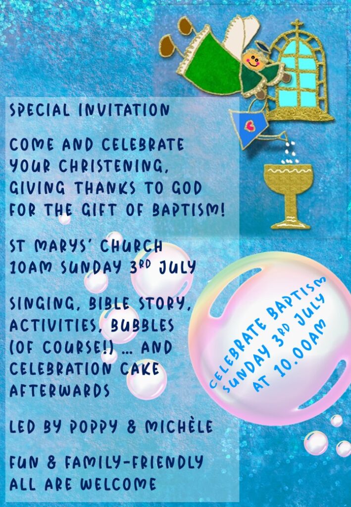 CELEBRATE BAPTISM: 10am, SUNDAY 3rd JULY 2022 There is a special invitation this Sunday to “Celebrate Baptism” at St Mary The Virgin & St Mary Magdalen, Tetbury Fun, family-friendly service…