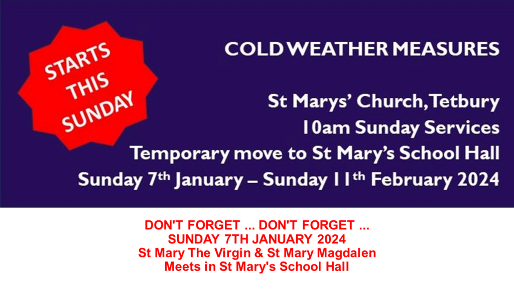 Sunday Worship, Sunday 7th January in St Mary’s School Hall St Mary’s School Hall: 10.00am Family Communion with Little Fishes Led by Canon Poppy Hughes You can also share in…